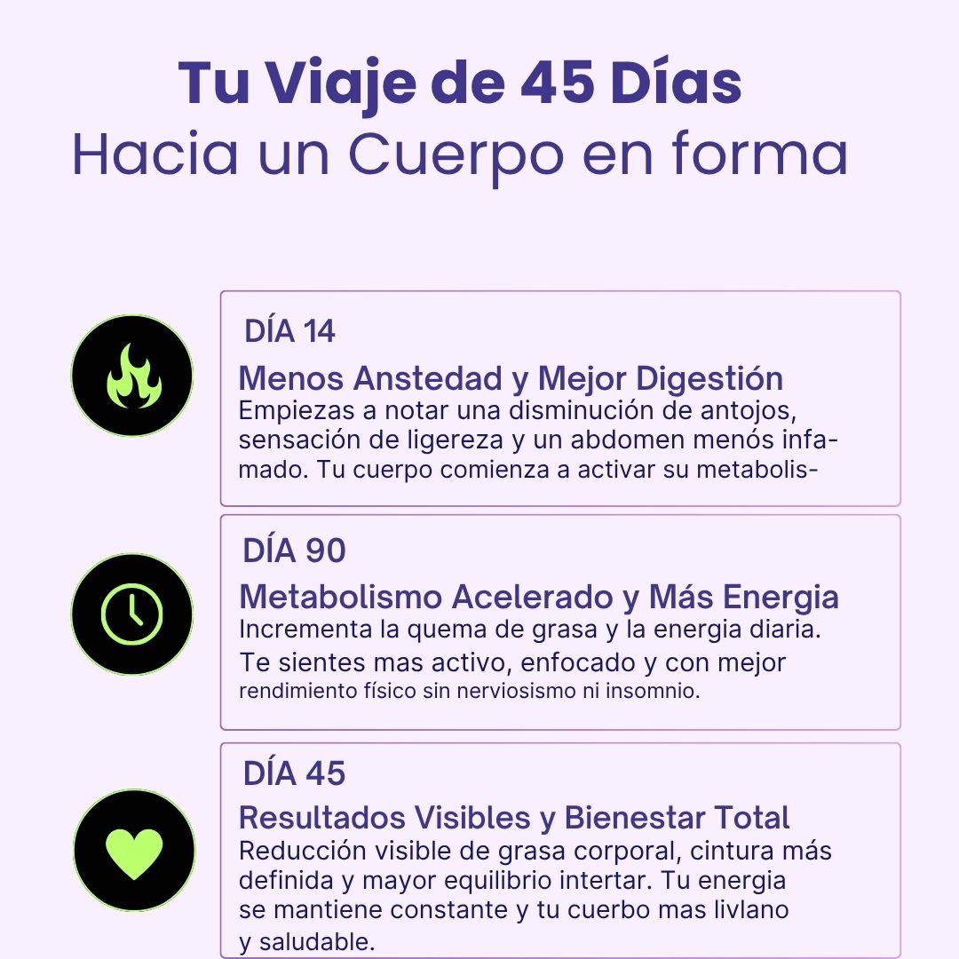 Depende del cuerpo de cada persona, pero la mayoría nota cambios desde la segunda semana: menos ansiedad, mejor digestión y sensación de ligereza. Los resultados visibles suelen llegar alrededor del día 30 a 45.